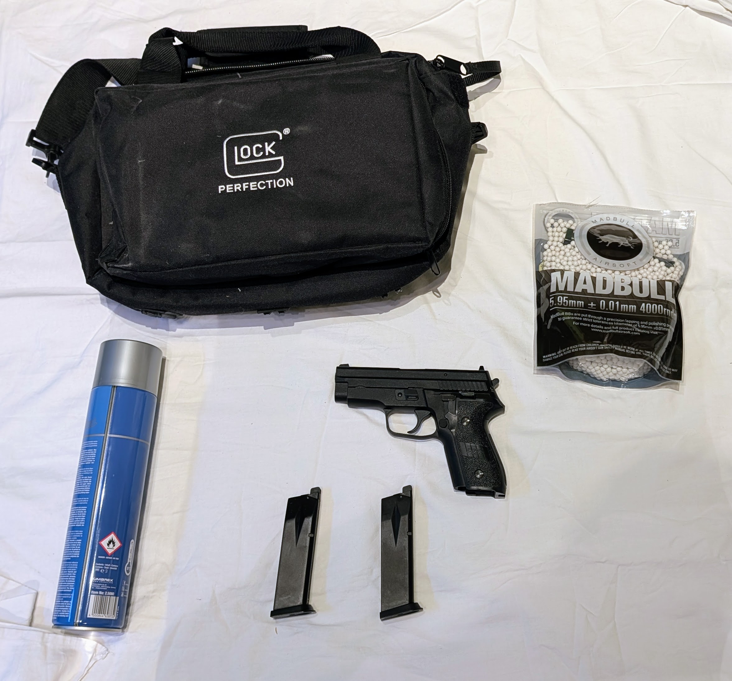 Vendu avec un deuxième chargeur, une sacoche et quelques accessoires (voir photo).